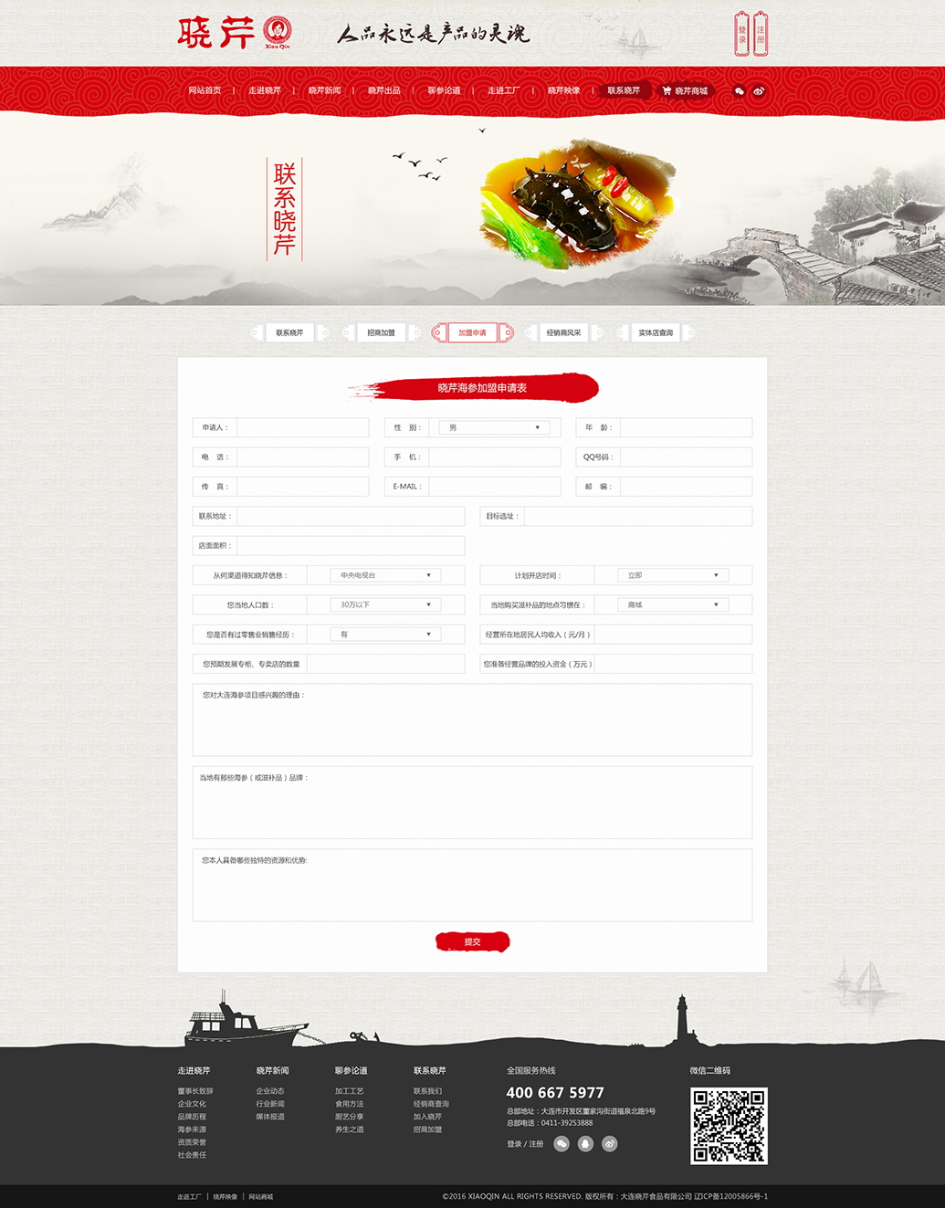 大(da)連曉芹食品(pin)有(yǒu)限(xian)公(gōng)司成(cheng)立于(yu)1999年(nian),昰(shi)中(zhong)國(guo)海參行業的(de)龍頭齊(qi)業之(zhi)一(yi)。公(gōng)司主(zhu)營(ying)海參、鮑魚、甲魚等(deng)産(chan)品(pin)。公(gōng)司海參采捕基地遍及(ji)大(da)連各海域(yu),公(gōng)司于(yu)2012年(nian)投(tou)資(zi)7000餘萬元建(jian)設(shè)占地面積約17000平方(fang)米的(de)全新(xin)自主(zhu)科(ke)研生(sheng)産(chan)基地,以(yi)滿足日(ri)益增長(zhang)的(de)市(shi)場(chang)需求,真正實現(xian)了(le)科(ke)研、生(sheng)産(chan)、深加(jia)工(gong)、銷售一(yi)體(ti)化的(de)運營(ying)體(ti)係(xi)。